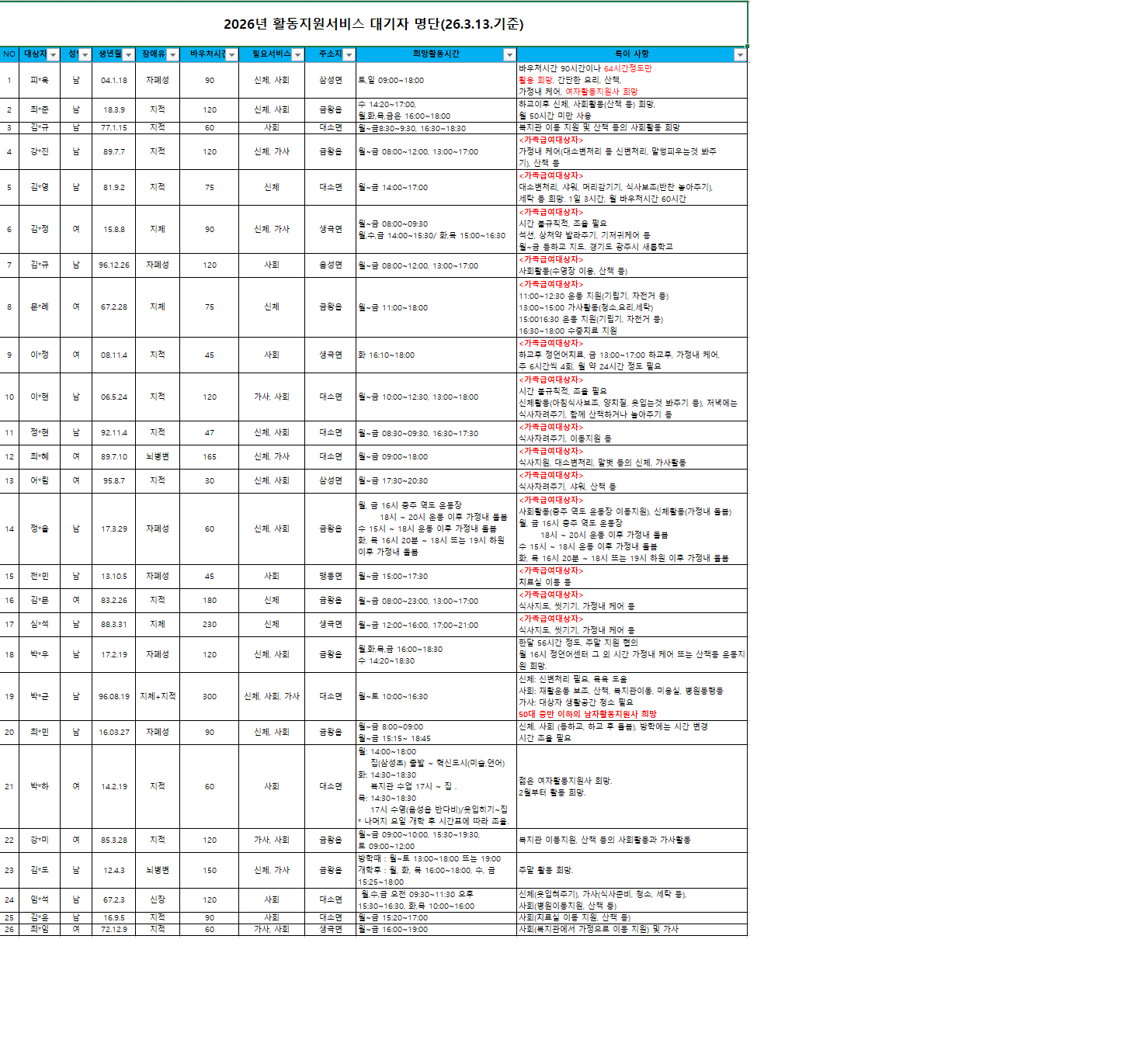 생년월일, 이름, 성별, 주소, 직업, 장애유형, 유·무선전화 중 1개 이상 등 준영구
